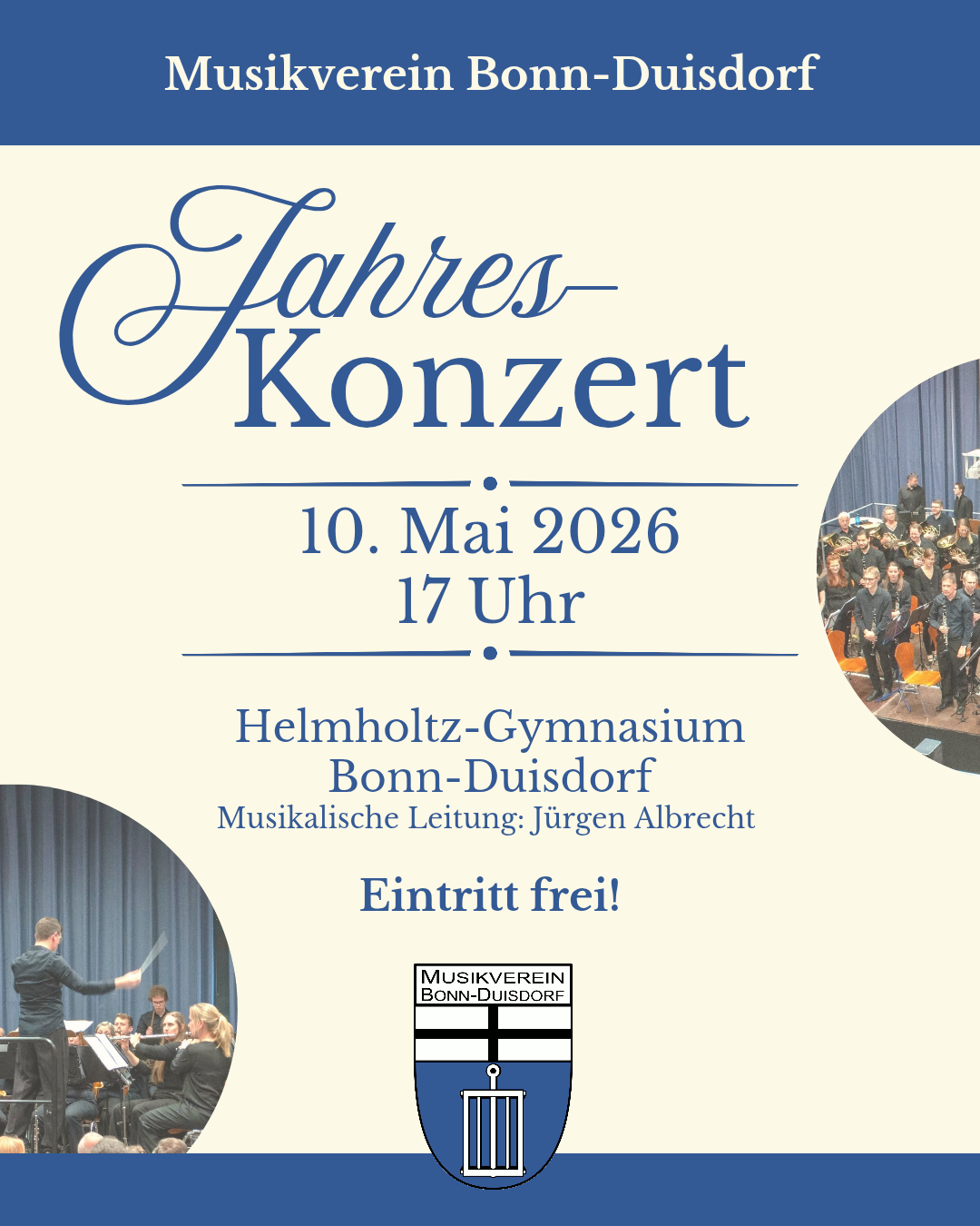 Der Musikverein Bonn-Duisdorf lädt am Sonntag, den 10. Mai, zu seinem diesjährigen Jahreskonzert ein. Beginn ist um 17 Uhr in der Aula des Helmholtz-Gymnasiums.